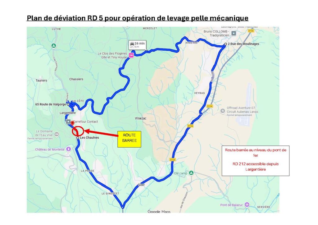 Suite à l’accident survenu au niveau du pont de Fer sur la RD 5 avant l’entrée de la commune de Largentière, la circulation sera coupée à tous les véhicules demain mercredi 19/11/2025 de 9 h 00 à 12 h 00.