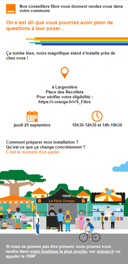Les conseillers fibre Orange vous donnent rendez-vous à Largentière le jeudi 25 septembre 🗓️ de 10h30 à 12h30 et de 14h à 18h30. ⏰